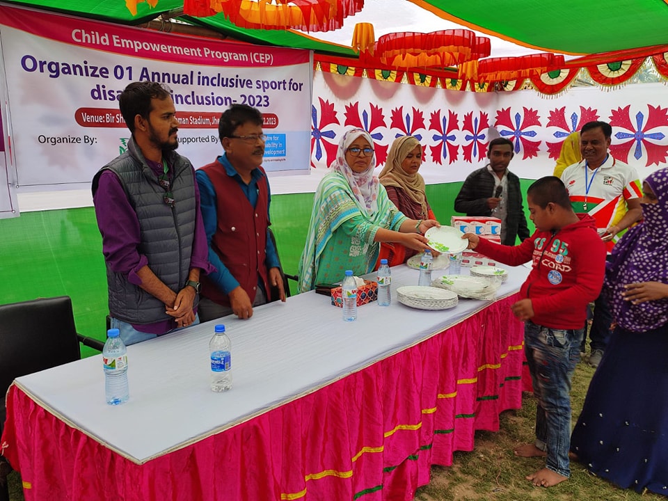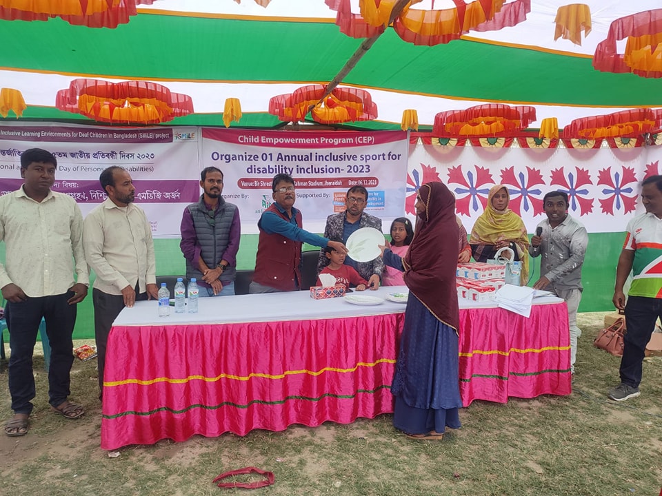 আন্তর্জাতিক ও জাতীয় প্রতিবন্ধী দিবস ৩ ডিসম্বর, ২০২৩ উদযাপন উপলক্ষে এইড Child empowerment programme - CEP ও Supporting meaningful inclusive learning environment for deaf children in Bangladesh -SMILE প্রকল্পের উদ্যোগে ধারাবাহিকভাবে শোভাযাত্রা, আলোচনা ও ক্রীড়ানুষ্ঠানের আয়োজন করা হয়। আজ ৬ ডিসেম্বর, ২০২৩ ঝিনাইদহে সুবর্ণ নাগরিকদের অংশগ্রহণে ক্রীড়া প্রতিযোগিতা অনুষ্ঠানে ঝিনাইদহ সদর উপজেলা নির্বাহী কর্মকর্তা ও সহকারী পরিচালক, সমাজ সেবা উপস্থিত থেকে অনুষ্টানটি উপভোগ করেন এবং প্রতিযোগিদের মাঝে পুরস্কার বিতরণ করেন।