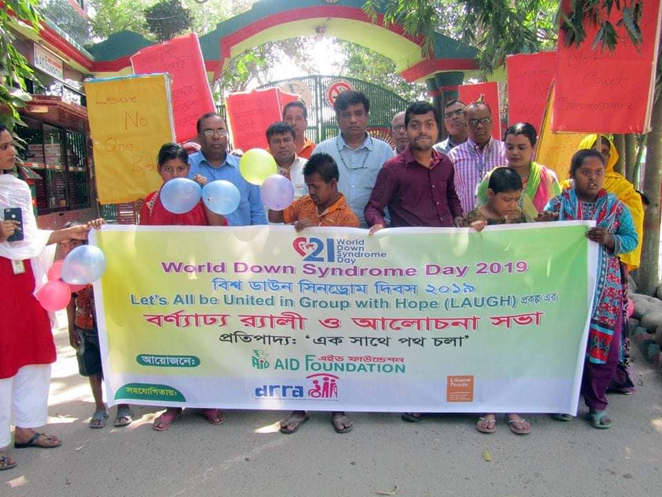 এলএফডিআরআরএ’র সহায়তায় এইড ফাউন্ডেশন কর্তৃক বস্তিবায়িত Let’s All be United in Group with Hope (LAUGH)প্রকল্পের আওতায় বিশ্ব ডাউন সিনড্রোম দিবস ২০১৯ উদ্যাপন উপলক্ষে ০৭ চৈত্র ১৪২৫ বঙ্গাব্দ (২১ মার্চ ২০১৯ খ্রিস্টাব্দ) সকাল ১০.৩০ টায় এইড কমপ্লেক্স ঝিনাইদহ থেকে এক বর্ণাঢ্য শোভাযাত্রা শুরু হয়ে শহরের প্রধান প্রধান সড়ক প্রদক্ষিণ করে পুনরায়
