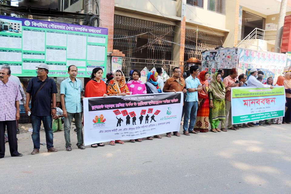 ইড সিজিবিভি প্রকল্প ও এইড জেন্ডার কমিটি এবং সমমনা বেসরকারি সংস্থাসমূহের যৌথ আয়োজনে নুসরাত জাহান রাফির ধর্ষক ও খুনীদের দৃষ্টান্ত মূলক শাস্তির দাবিতে ঝিনাইদহ শহরের প্রাণ কেন্দ্র স্থানীয় পোস্ট অফিস মোড়ে অদ্য ০৮ বৈশাখ ১৪২৬ বঙ্গাব্দ (২১ এপ্রিল ২০১৯ খ্রিস্টাব্দ) সকাল ১০.০০ টায় মানববন্ধন অনুষ্ঠিত হয়। মানববন্ধনে শত শত লোক