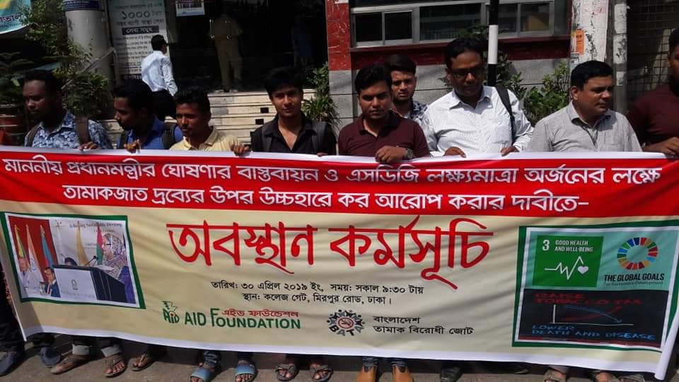 বাংলাদেশ তামাক বিরোধী জোট ও এইড ফাউন্ডেশন-এর উদ্যোগে আজ ৩০ এপ্রিল ২০১৯ সকাল সাড়ে ৯.৩০ টায় শহীদ সোহরাওয়ার্দী মেডিকেল কলেজ এর সামনে “মাননীয় প্রধানমন্ত্রীর ঘোষণার বাস্তবায়ন ও এসডিজি লক্ষ্যমাত্রা অর্জনের লক্ষে তামাকজাত দ্রব্যের উপর উচ্চহারে কর আরোপ করার দাবীতে” অবস্থান কর্মসূচি অনুষ্ঠিত হয়। উক্ত অবস্থান কর্মসূচিতে বক্তারা বলেন, ২০১৬ সালে ‘টেকসই